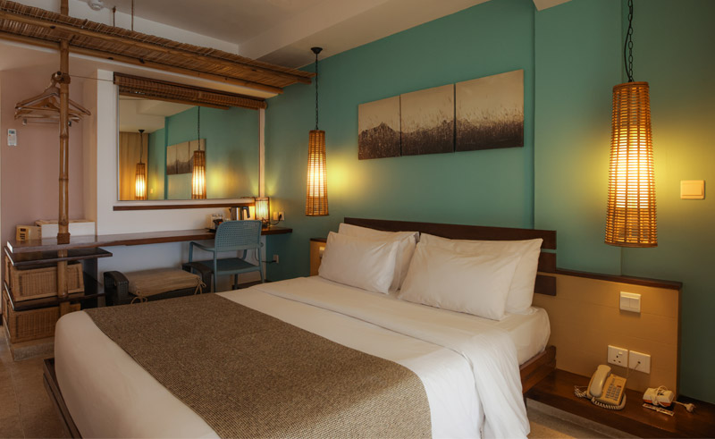 Standard Vue Mer, d’une superficie de 25m², comprenant un lit King Size, une salle d'eau et un balcon avec une vue sur la mer.