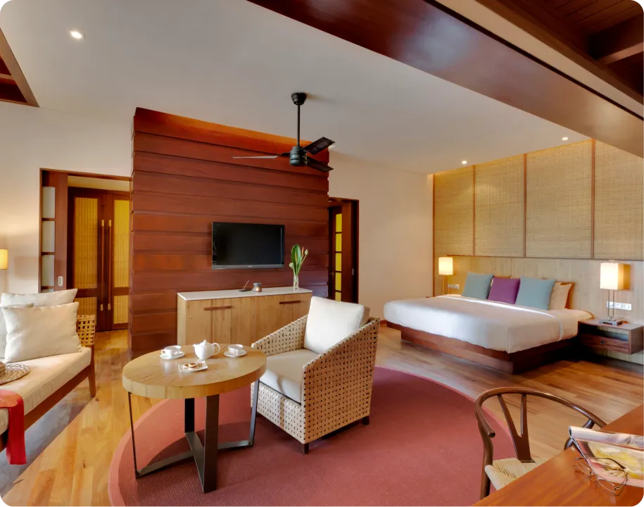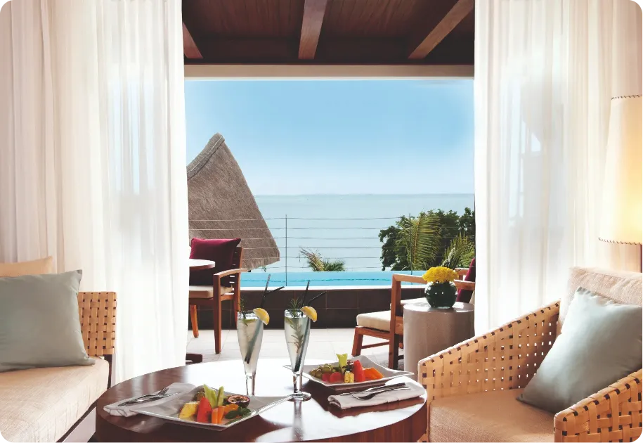 Avec un balcon privé doté d'une piscine à débordement chauffée – option de piscine chauffée disponible – donnant sur les jardins luxuriants de notre complexe mauricien, les magnifiques piscines et le magnifique océan, vous n'aurez que l'embarras du choix de vues dans ce généreux 84 m² (904 pieds carrés) suite au dernier étage. Débordant de romantisme avec ses parquets en bois richement travaillés, ses murs en rotin tressé, son bel extérieur en pierre naturelle, son mobilier élégant aux couleurs douces et sa salle de bains luxueuse composée des meilleurs matériaux nobles, cette demeure avec vue sur la mer promet une escapade des plus idylliques.